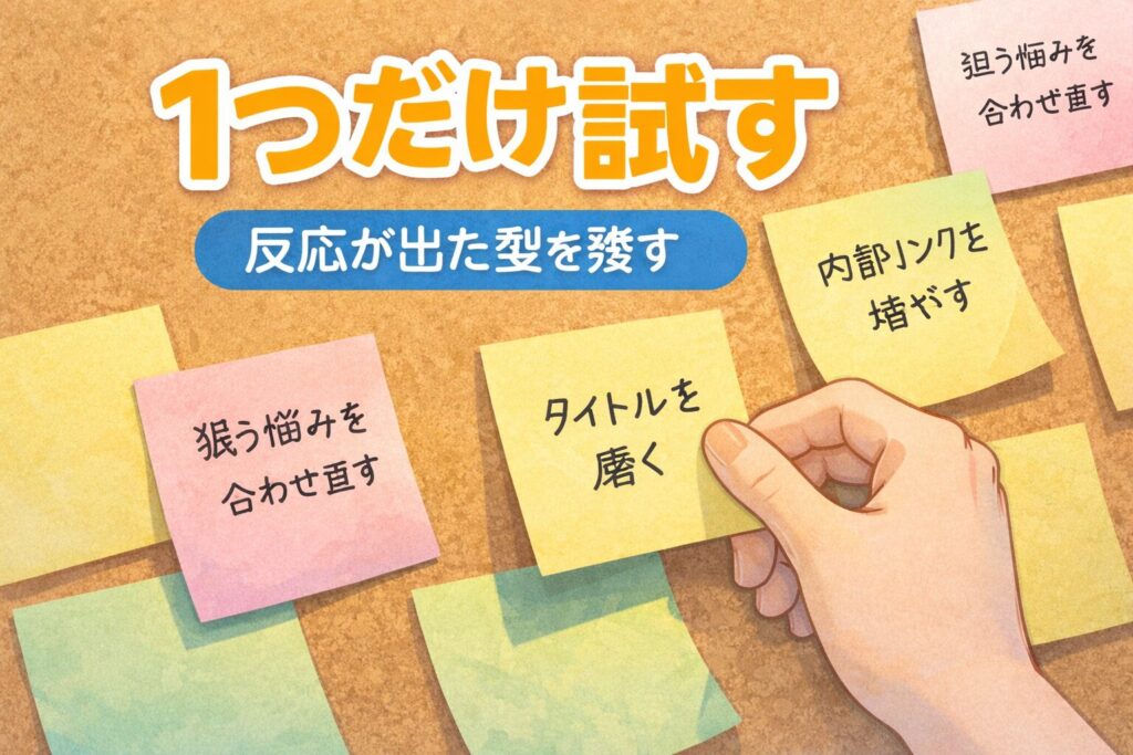 整えたのに伸びないと感じると、全部を一気に変えたくなります。でも大きく変えるほど、何が効いたのか分からなくなって不安も増えます。ここでおすすめなのは、1回に変えるのは1つだけ、と決めて小さく試すことです。たとえば「タイトルだけ言い回しを変える」「冒頭の宣言文を入れる」「内部リンクの置き方を変える」など、どれか一つに絞ります。そして数日〜1週間ほど様子を見て、Search Consoleの表示回数やクリック、滞在の感触を静かに確認します。結果はすぐに大きく動かなくても、少しでも良くなった手応えがあれば、それがあなたのサイトに合う型です。逆に合わなければ戻せばいいだけなので、怖がらなくて大丈夫です。試すときは、読者の気持ちを基準にします。「このタイトルなら自分なら押すかな」「冒頭で安心できるかな」と想像すると、改善点が見つかりやすいです。こうして小さな実験を積み重ねると、記事が増えるほど迷いが減り、書くスピードも自然に上がります。伸びない時期は停滞ではなく、型を作っている途中です。小さく試して、反応が出た型だけを残していきましょう。