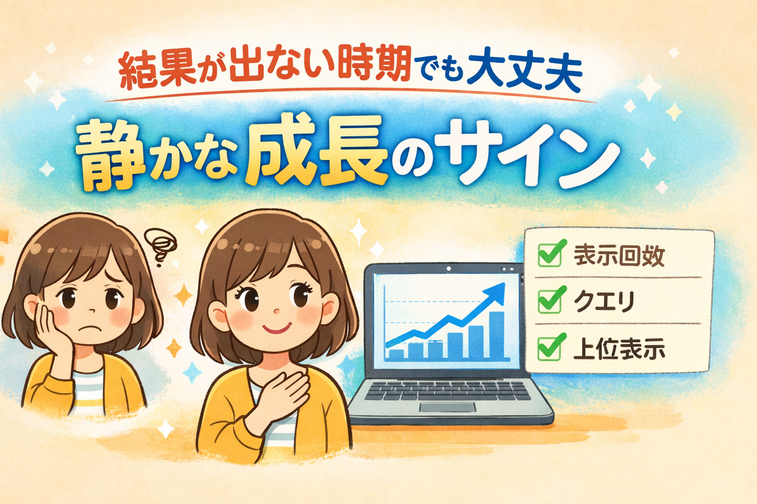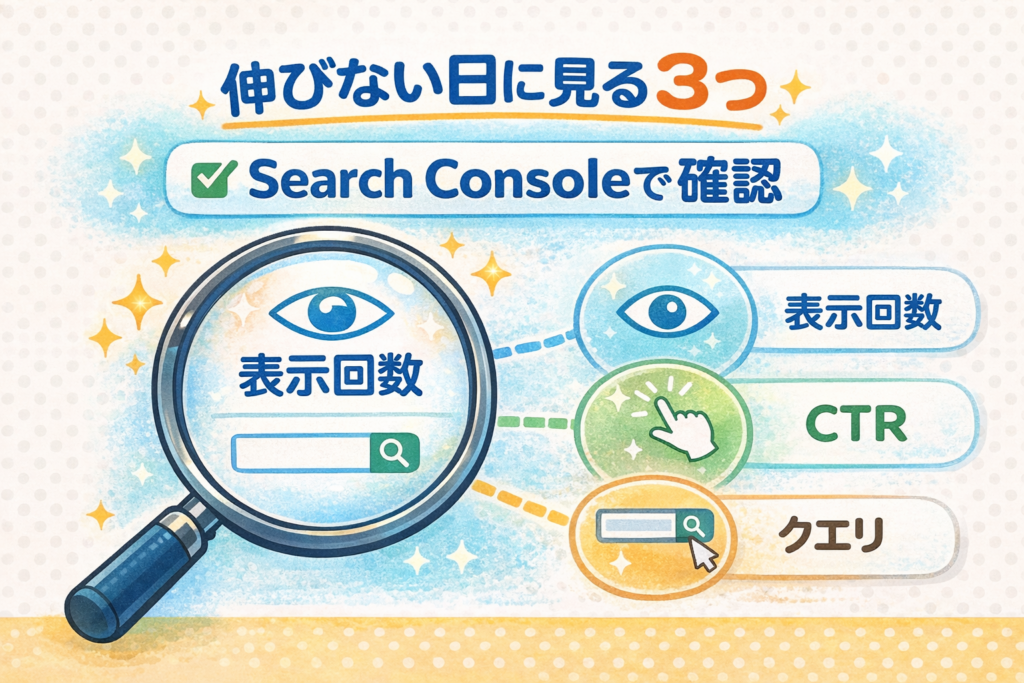 前回、週1ルーティンで1記事1改善を回せる形ができました。ここまで整えたのに、数日〜1週間たっても数字が動かないと、胸がざわつきますよね。「私のやり方、間違ってるのかな…」って。そんな結果が出ない時期こそ、Search Consoleは味方です。表示回数やCTRの“伸び”だけじゃなく、クエリの寄り方や平均掲載順位の揺れ、検索結果で読まれ始めた入口など、静かな成長のサインはちゃんと残っています。この記事では、その小さな合図を拾って、読者ファーストで「安心して読み進められる答え方」に結びつける見方をまとめます。焦らなくて大丈夫。あなたの小さな積み重ねは、少しずつ届き始めています。
