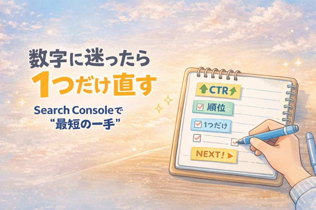 Search Consoleを開いたのに、数字が多すぎて「結局、今日は何を直せばいいの?」と手が止まってしまう日、ありますよね。頑張って書いているのに結果が見えないと、焦りや不安がじわっと増えてしまうものです。この記事では、Search Consoleの平均掲載順位とCTRをセットで見て、いま一番伸びしろがある伸びしろクエリを見つけ、次の「1記事1改善」を迷わず決める方法をまとめます。クリックが増えたあとに次へ進むためにも、まずは“読者が探しているのに、まだ選ばれていない場所”を特定するのが近道。派手な一発より、静かに効く小さな積み重ねで大丈夫です。読み終えたら、あなたのサイトでも今日すぐに「次の一手」が決まり、読者ファーストの改善を一歩だけ前に進められます。