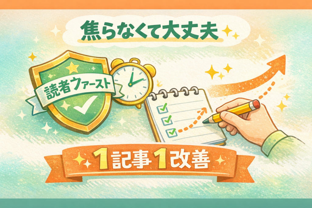 週1で見るって、最初は簡単そうに見えて、実はすごく勇気がいりますよね。毎日確認したくなる不安をぐっとこらえて、「焦らない仕組み」を選ぶからです。でも、その選択は間違いなく強いです。あなたが作ろうとしているのは、数字を追いかけるブログじゃなくて、読者の時間を守るブログです。週1で一手だけ整えると、記事は落ち着いて育っていきますし、あなたの心も守れます。もし今週、数字が動かなくても大丈夫。1記事1改善を続けた事実は消えません。小さな一手を積み上げているあなたの記事は、きっと誰かの「助かった」に変わっていきます。続けられる形を守れたら、それだけで十分誇っていいです。