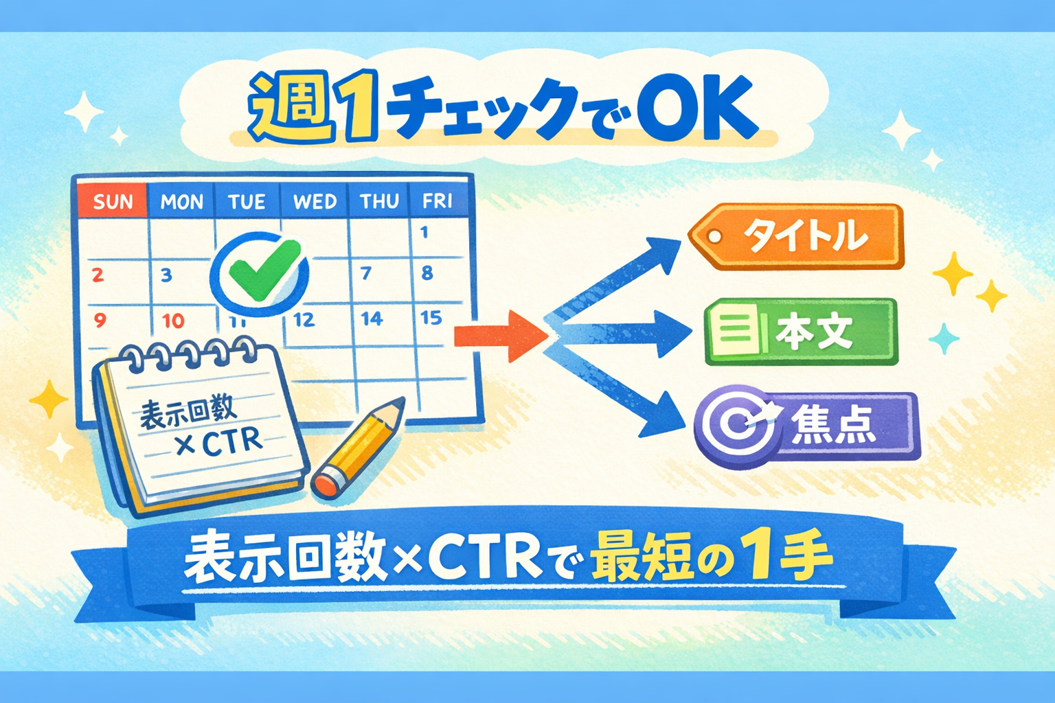 この記事では、週1のタイミングでSearch Consoleのどこを見て、表示回数×CTRの組み合わせから「タイトル/本文/焦点」のどれを触るかを決め、1記事1改善で実行する流れを整えます。チェックする項目は多くありません。読者ファーストの改善を、迷わず続けられる形にしていきましょう。